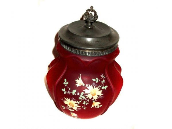 SoldCranberry Snowstorm Victorian Glass & Silverplate Biscuit JarGreat rich cranberry color makes up this fine Victorian craquelle art glass biscuit jar complete with silverplate mountings. This a great addition to any art glass collection. Measures 7" tall to topSee Sold Price