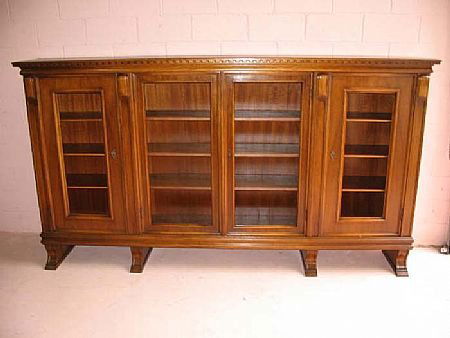 SoldFRENCH WALNUT BOOKCASE HAVING FOUR DOORS AND FOUR DRAWERS C 1940.French walnut bookcase having four doors and four drawers C 1940. Ht: 55.5" Wd: 71" Dpth: 17.5"See Sold Price