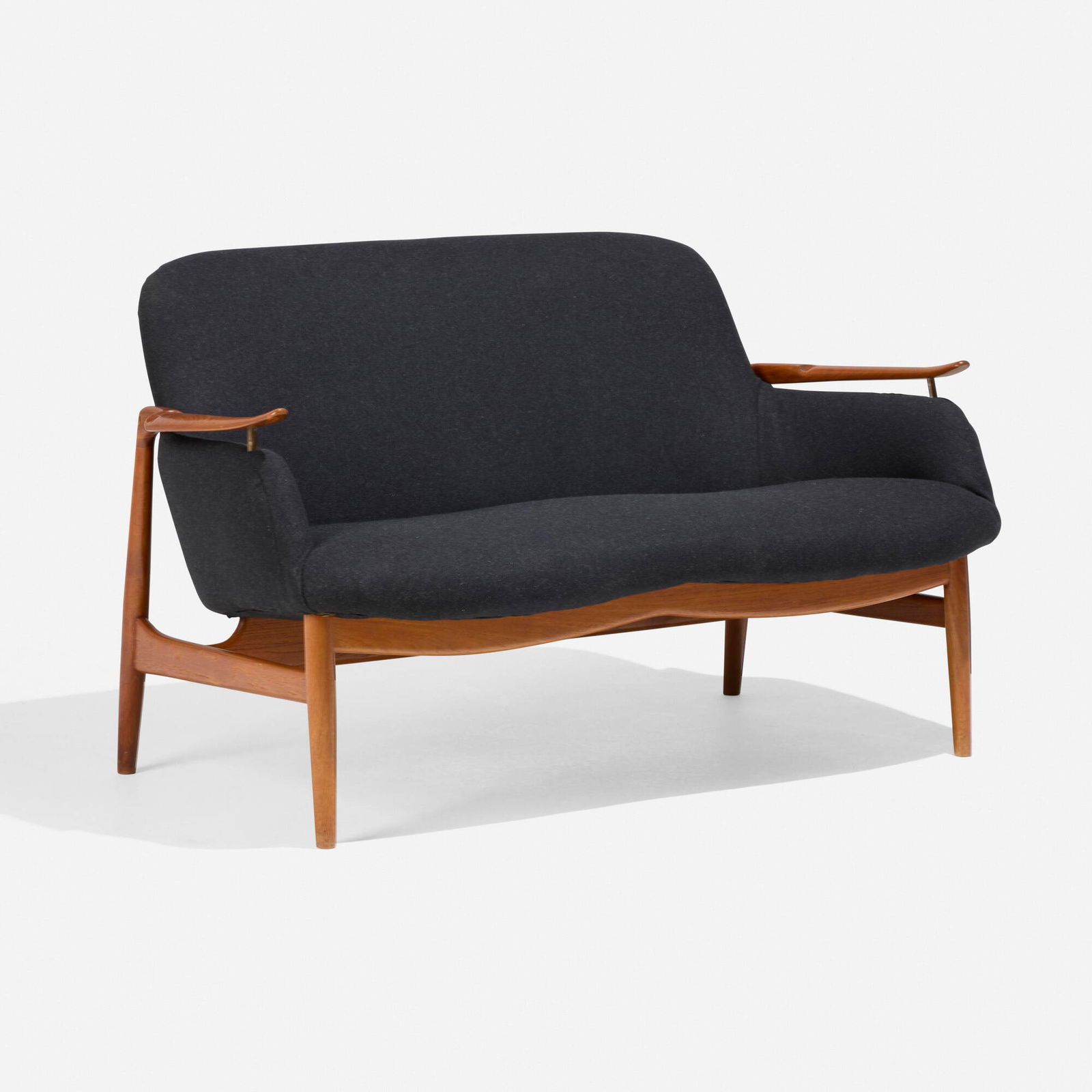 Finn Juhl, NV-53 SetteeFINN JUHLSettee, model no. NV-53, ca. 1953Teak, fabric, brass. Manufactured by Niels Vodder, Denmark.Underside with retailer's plaque. 30" H x 51" W x 29" DSeSee Sold Price