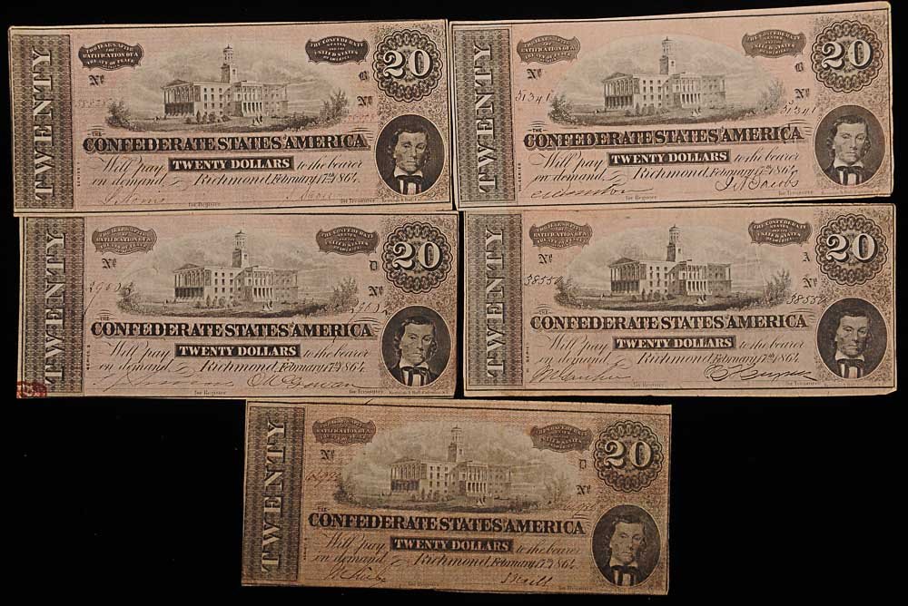 1861 Confederate States of America $20 Note. Richmond, September 2, 18617 days Left1864 $50 Confederate States of America Richmond CSA Bank Note T-66 Grades vf25Mar 06, 2026Confederate States of America. Group of Four [4] Two Dollars Banknotes.Mar 11, 2026Confederate Fractional Currency NotesMar 02, 2026Feb. 17th, 1864 Confederate States Of America $500 NoteFeb 27, 20261864 $20 Confederate States Of America CSA, T-67 Grades xf45Mar 08, 2026US 1862-1863 A Collection of CSA and Southern State Banknotes1864 $5 Confederate States Of America CSA, T-69 Grades xf45Mar 08, 2026Confederate States Of America Banknote Currency (6)4 days Left1864 $10 Confederate States Of America CSA, T-68 Grades xf40Mar 08, 2026Confederate States of America. Group of Four [4] Fifty Cents Banknotes.Mar 11, 20261864 $5 Confederate States Of America CSA, T-69 Grades au53Mar 06, 2026Confederate States of America. Group of Three [3] One, Five and Fifty Dollars Banknotes.Mar 11, 2026Confederate States of America, Two Dollars T70.Mar 11, 20261862 $2 Confederate States T-43 PMG F15 Certified NoteFeb 27, 20261864 $5 Confederate States Of America CSA, T-69 Mint Error Grades vf35Mar 06, 2026