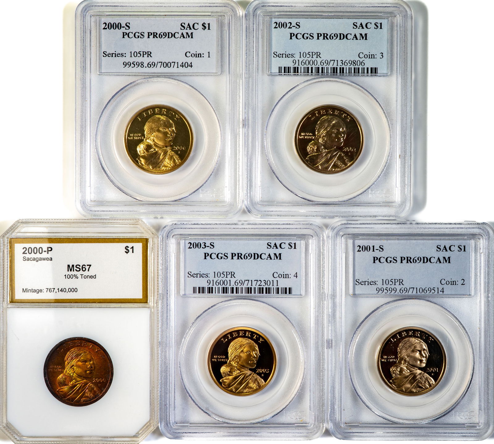 Five (5) Graded $1 Sacagawea PR69DCAM