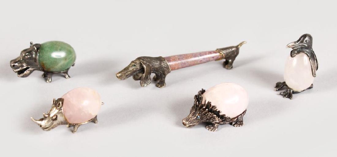 FIVE .800 SILVER MOUNTED ANIMALS, Penguin, Hedgehog,