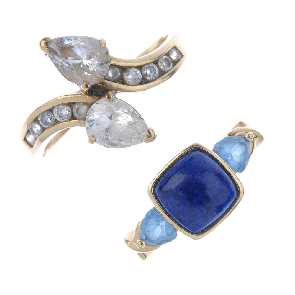 Five 9ct gold gem-set rings. To include a blue topaz