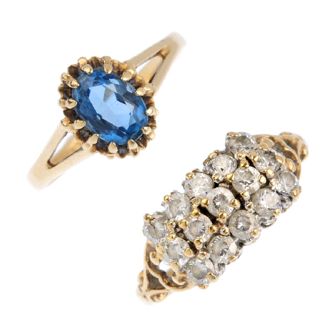 Five 9ct gold gem-set rings. To include a shell cameo