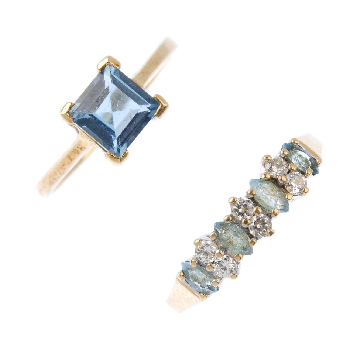 Five 9ct gold gem-set rings. To include a tanzanite