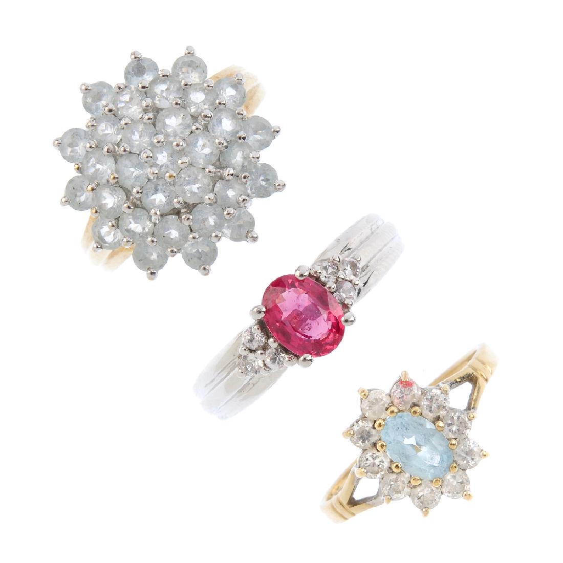 SoldThree 9ct gold diamond and gem-set rings. To include aThree 9ct gold diamond and gem-set rings. To include a blue topaz and diamond cluster ring, an amethyst single-stone ring, with a pink and colourless cubic zirconia five-stone ring. Hallmarks for 9ctSee Sold Price