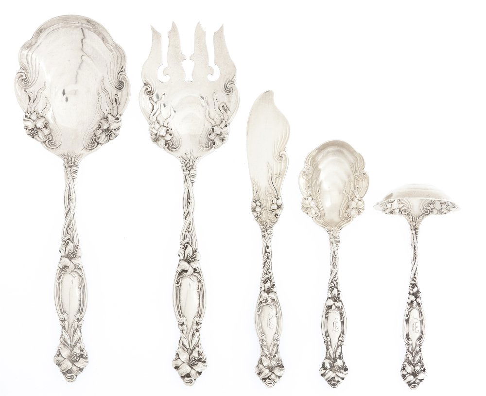SoldA group of American sterling flatware piecesA five piece group of American sterling silver flatware serving piecesvarious makers20th centuryComprising a Louis XV salad serving set, monogram: MAP, a Durgin Chrysanthemum asparagus server, a WallaSee Sold Price