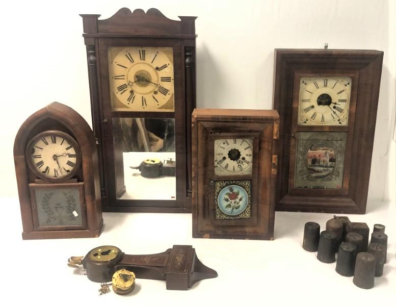 FIVE ANTIQUE CLOCKS LOT: DANIEL PRATT JR, ETC.