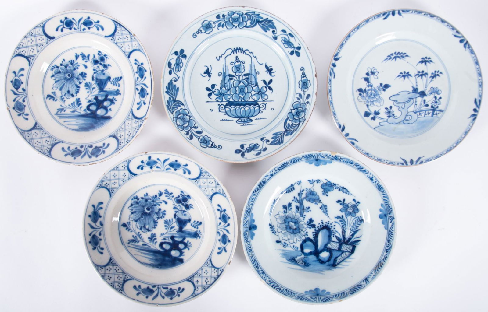 Five Antique Delft Blue and White Plates