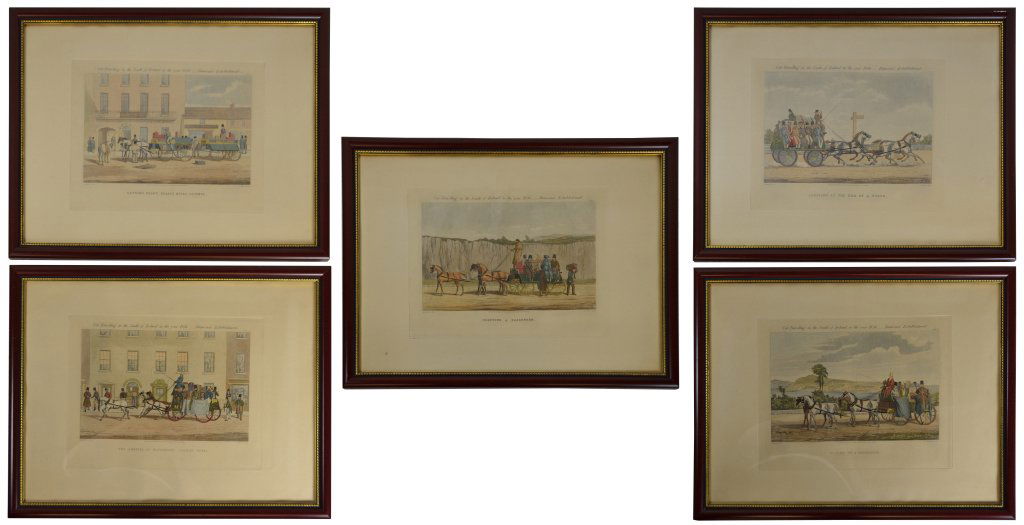 FIVE ANTIQUE VICTORIAN HAND COLORED ETCHINGS