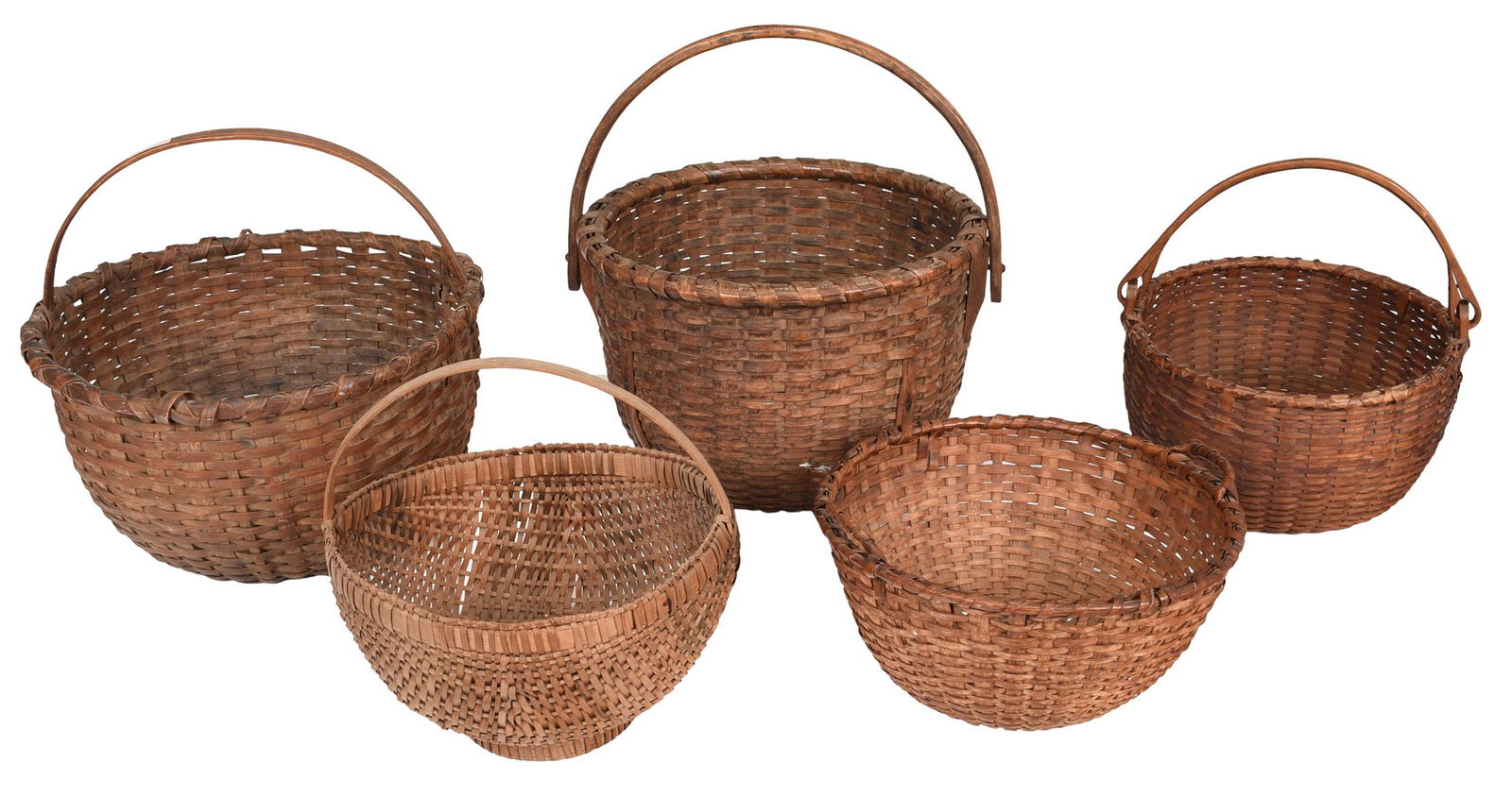 FIVE AMERICAN SPLINT-WOVEN MINIATURE BASKETS WITH HANDLES. Buttocks basket with God's eye, 5"h.Amelia Jeffers, Auctioneers & Appraisers4.6(180)$703 days Left