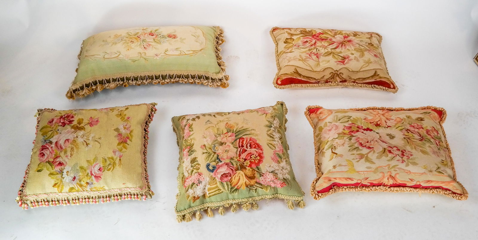 SoldLot of Five Aubusson PillowsLot of five Aubusson pillows. [24 x 24 inches; Largest: 17 x 28 inches]. One pillow back torn.See Sold Price