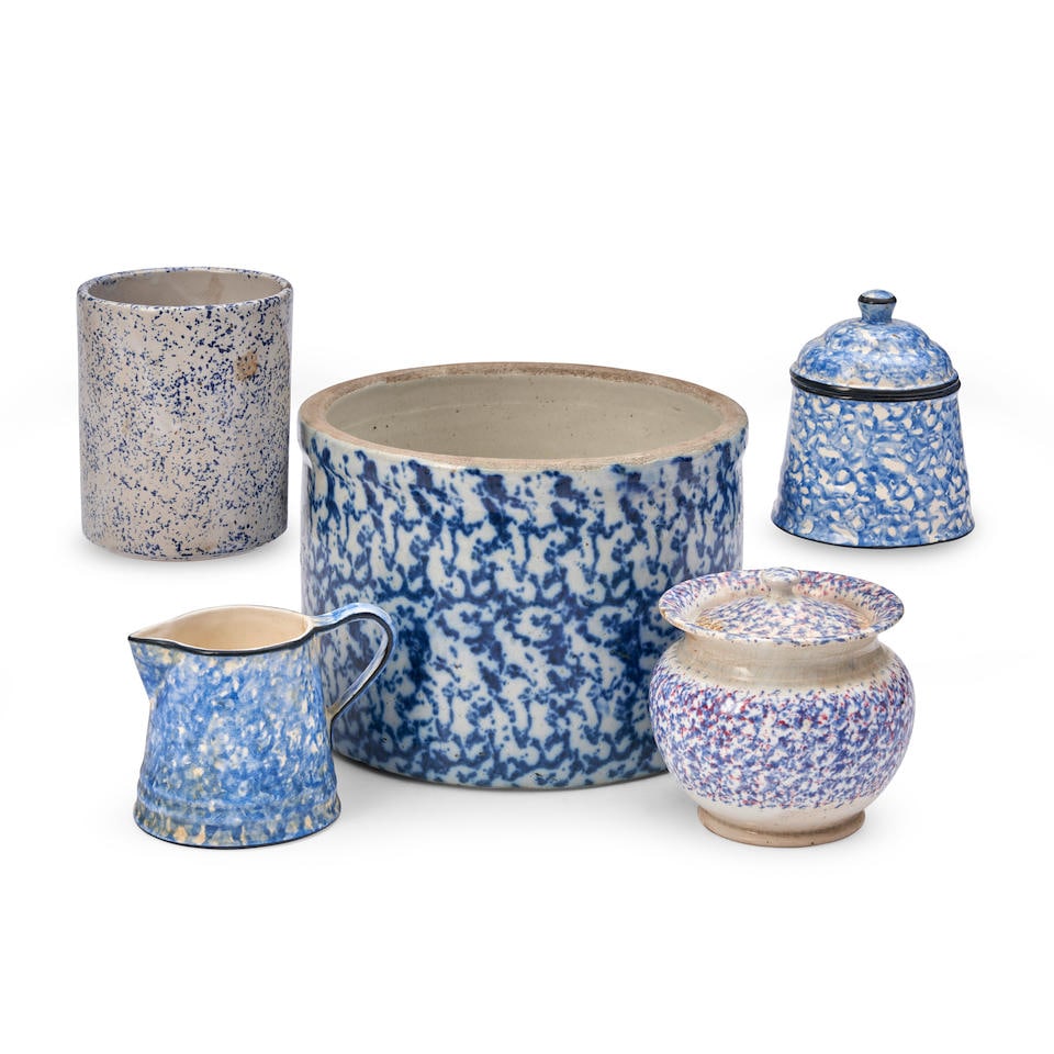 FIVE BLUE AND WHITE SPONGEWARE CERAMICS