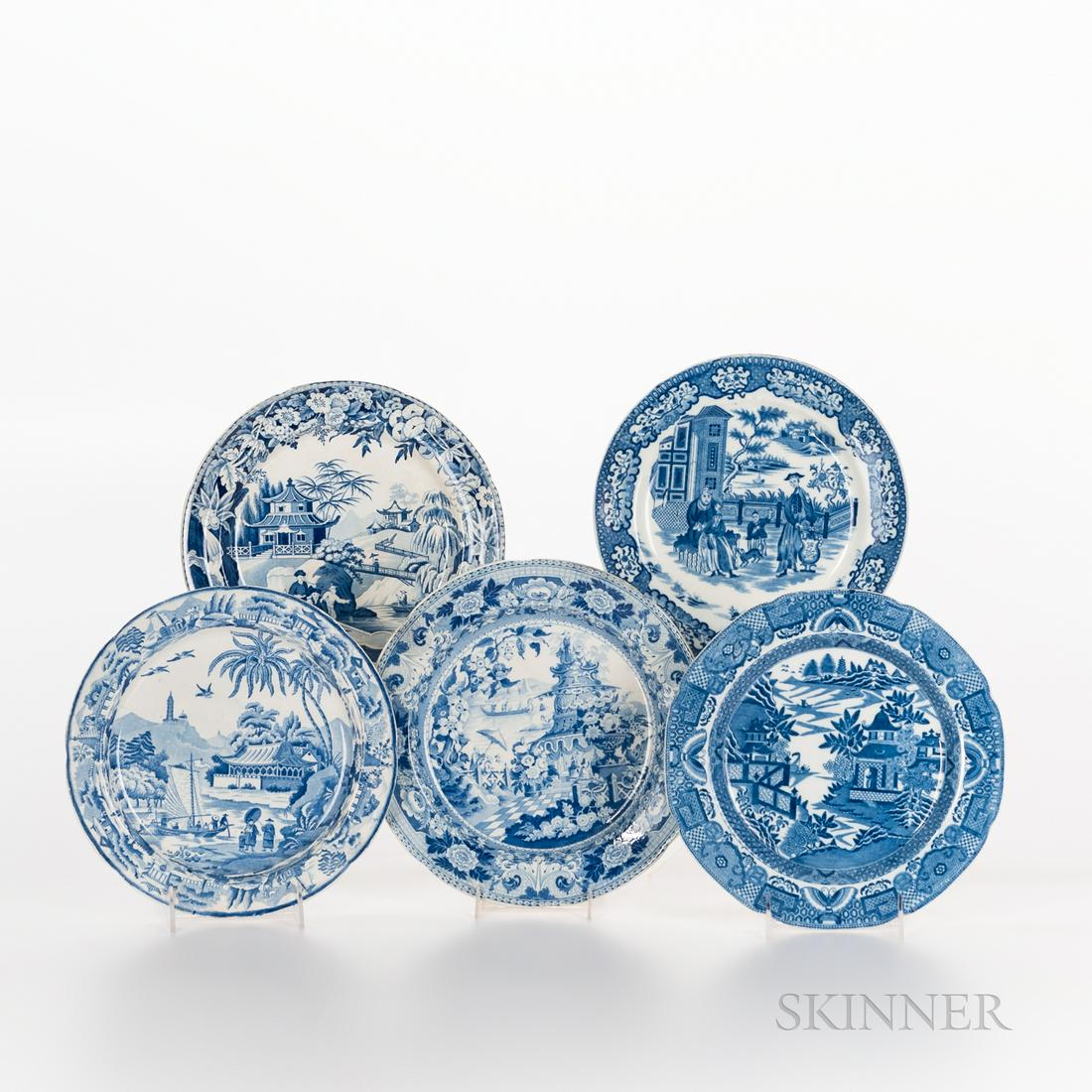 Five Blue Transfer Earthenware Plates, England, c.