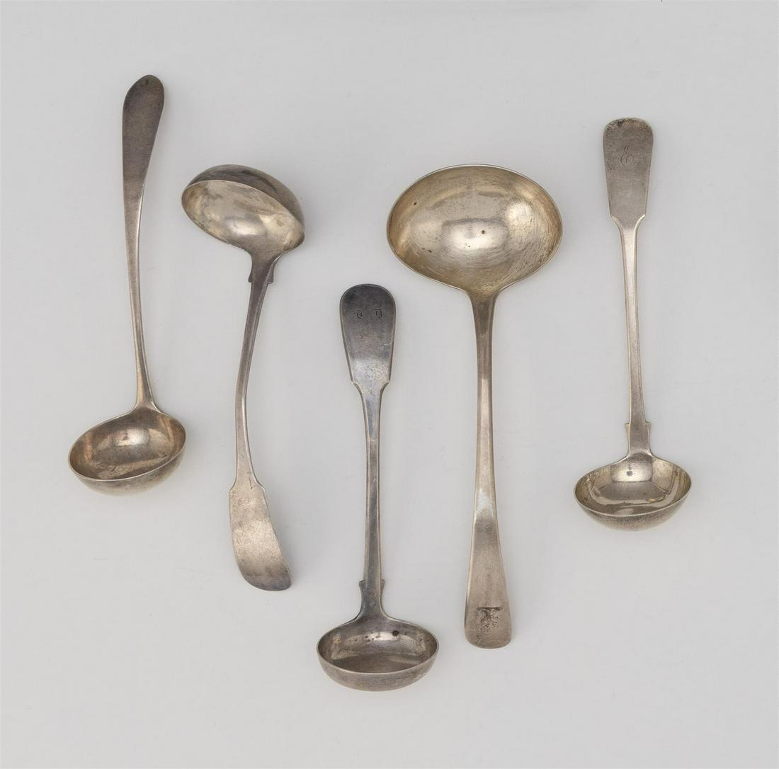 FIVE BRITISH STERLING SILVER SAUCE LADLES Four