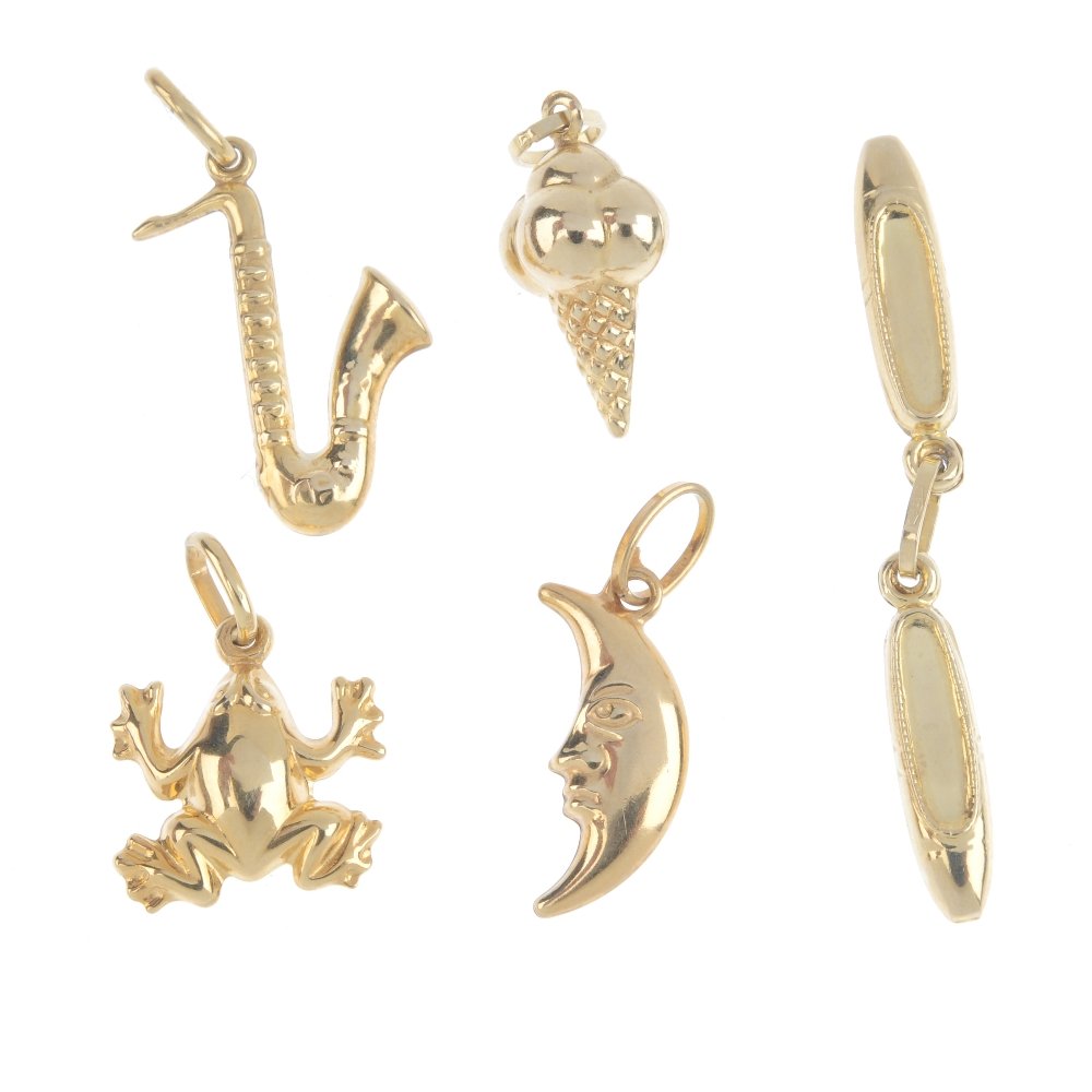 Five charms. To include a 9ct gold frog charm, a 9ct