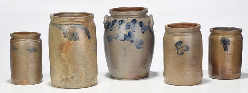 Five Cobalt Decorated Stoneware Crocks