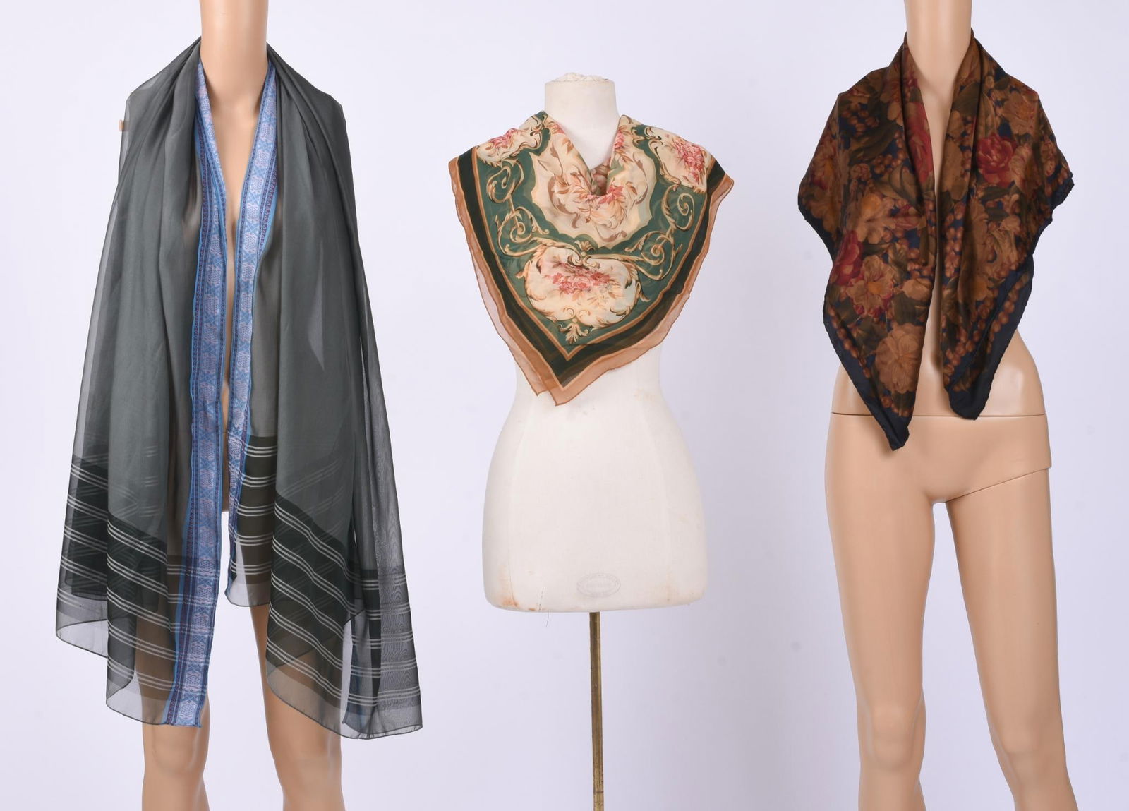 FIVE DESIGNER SCARVES.
