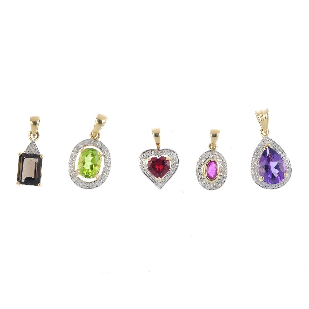 Five diamond and gem-set pendants. To include a 9ct