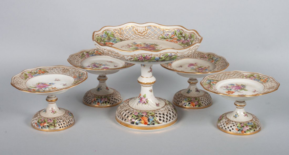 Five Dresden reticulated porcelain compotes