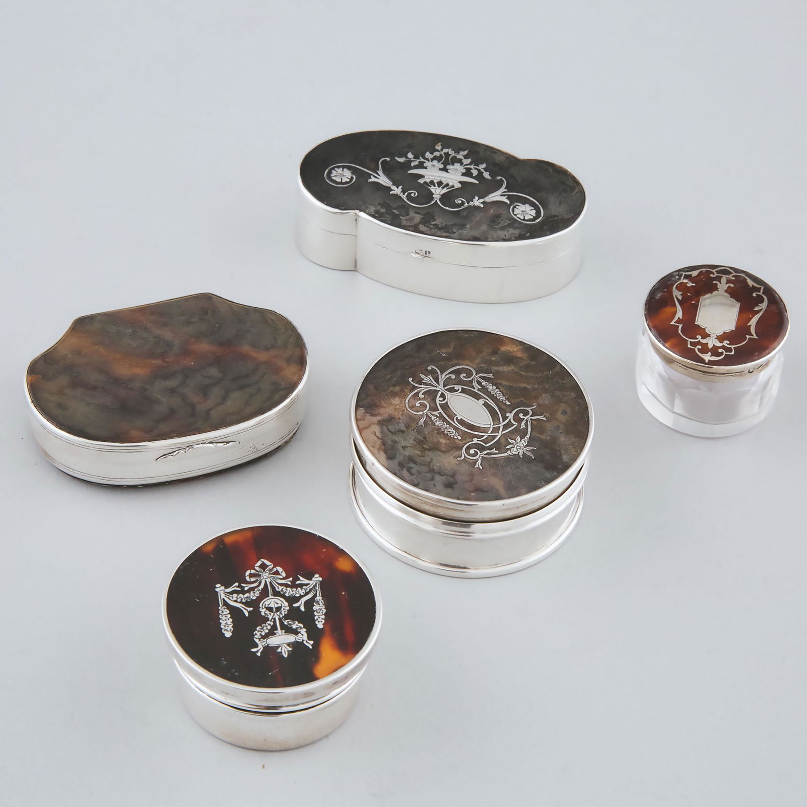 Five English Silver and Tortoiseshell Boxes and Jars, Londo