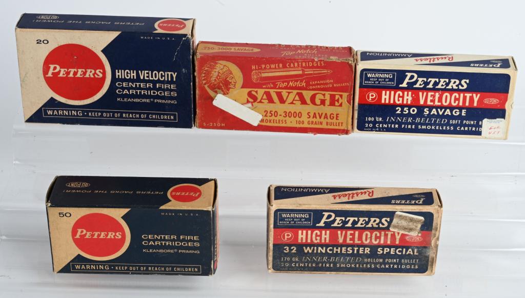 FIVE FULL BOXES SAVAGE & PETERS ASSORTED AMMO