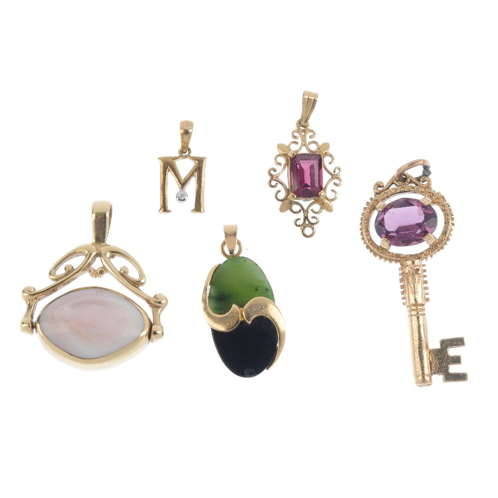 Five gem-set pendants. To include an oval-shape purple