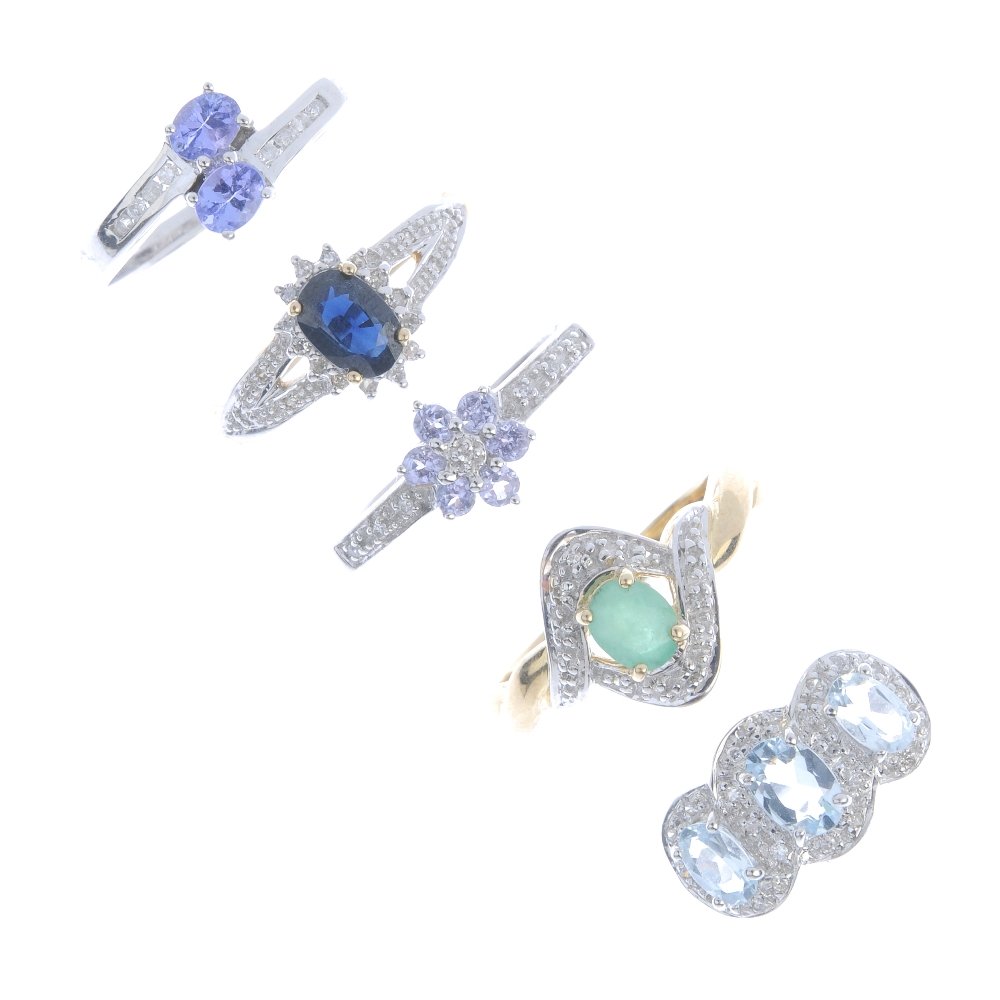 Five gem-set rings. To include a blue topaz triple