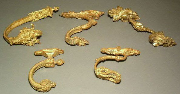Five gilt metal tiebacks, various sizes and shapes