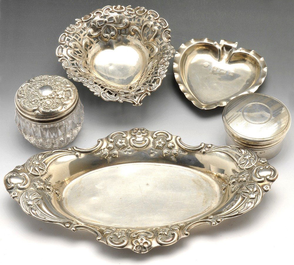 Large Silverplate Lot4 days LeftEstate lot STERLING SILVER, from Virginia estate, includes (6) STIEF small dishes, bowls, plate,4 days LeftLot of Victorian Silverplate Serving PiecesFeb 12, 2026Lot 5 Glass Gilt Decorative Dishes Turkey1 day LeftEnglish Sterling Dish Bowl Servers Knife Rest LOTFeb 11, 2026Hawkes, Clark, & More Early Cut Crystal (6pcs)5 days LeftWilliam Adams, Etc. Silver Plate Tableware, 8 Pcs.Mar 12, 2026Five Sterling Silver DishesFeb 12, 2026A set of four French pierced silver two-handled dishes Henri Soufflot, with first standard Miner...Mexican Sterling Silver Covered Dish and Set of Eleven Small Dishes3 days LeftFour Pieces Of Assorted Silver,Victorian Silver Plate Bun Warmer and Quadruple Plate Fruit Bowl3 days LeftTiffany, Gorham Et Al Group of Sterling Bowls, 54 days LeftGroup of Five Assorted Silver Plated Serving Trays2 days LeftSet of Four Continental Silver and Glass Figural Salts3 days LeftAN AMERICAN SILVER SEVEN-PIECE TEA AND COFFEE SERVICE AND TRAY MARK OF TIFFANY & CO., NEW YORK,Feb 19, 2026