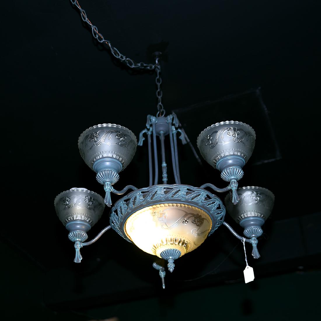 SoldAmerican Bronze and Glass Five Light Chandelier. c. 1930, with a conical brass center issuing fourAmerican Bronze and Glass Five Light Chandelier. c. 1930, with a conical brass center issuing four scrolled supports and a central frosted glass domed shade with an interior light, centering four outeSee Sold Price