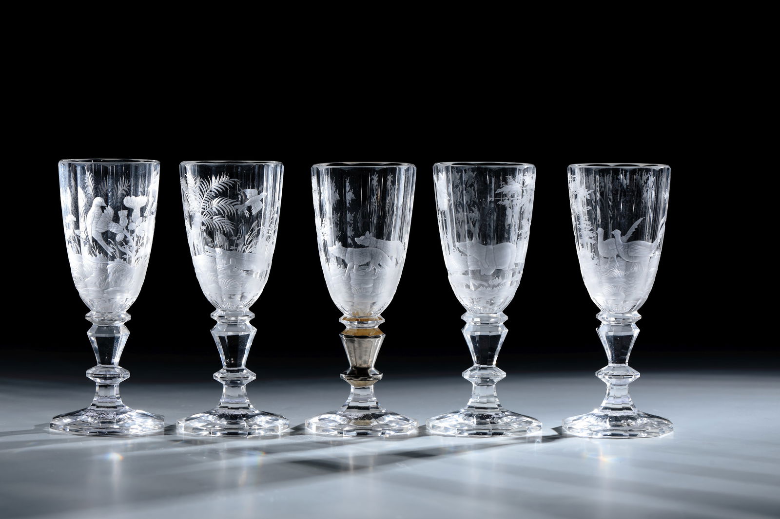 Five Liqueur Glasses with Animals