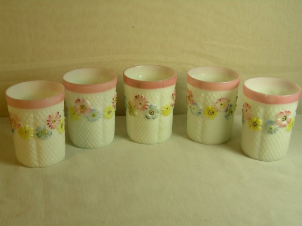 FIVE PAINTED PATTERN MILK GLASS TUMBLERS