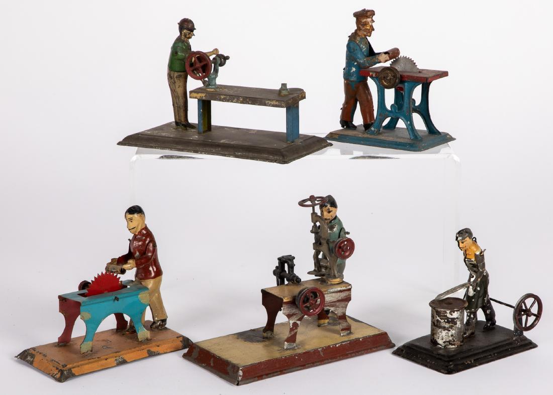 Five painted tin workmen steam toy accessories