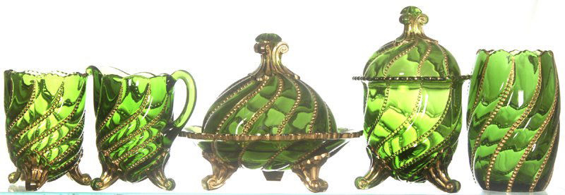FIVE PIECE EMERALD GREEN BEADED SWIRL PATTERN GLAS