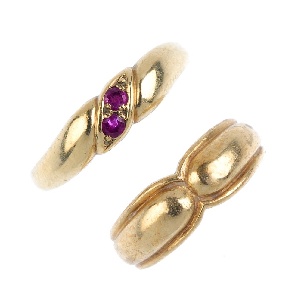 Five rings. To include a 9ct gold tri-colour trinity