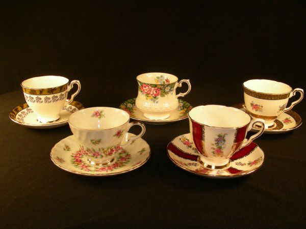 FIVE SETS ENGLISH BONE CHINA CUPS AND SAUCERS
