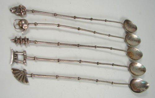 Five Silver Ice Tea Spoons with Oriental motif. E