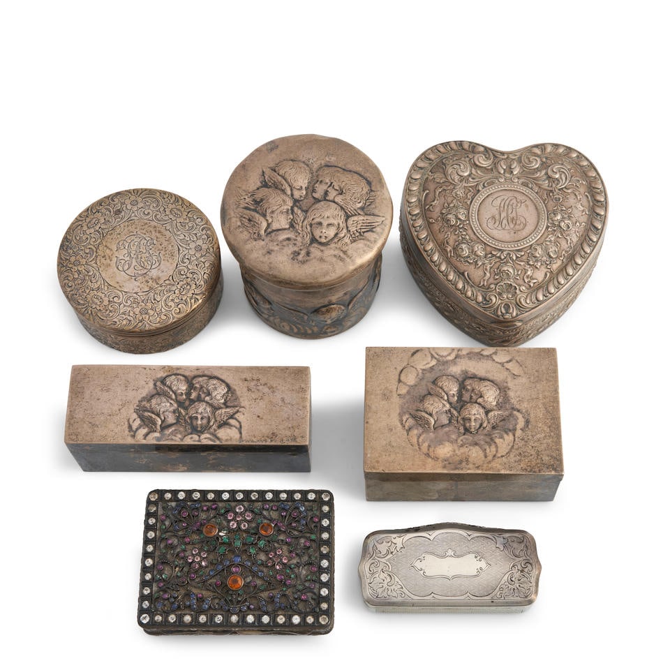 Lot - 2 Mahogany Jewelry Boxes, Poker Chips, Etc.4 days LeftLOT ANTIQUE BRONZE BOXES, VANITY ITEMS, ETCMar 07, 2026Lot Wood, Porcelain, & Marble Dresser BoxesMar 04, 2026ASSORTED ANTIQUE AND COLLECTIBLE ARTICLES, LOT OF TENMar 04, 2026Lot of 5 Asian Brass & Enamel Boxes.4 days LeftAMERICAN STERLING AND COIN SILVER ARTICLES, LOT OF FIVEMar 04, 2026ASSORTED SILVER-PLATED AND OTHER ARTICLES, LOT OF SEVENMar 04, 2026DUTCH AND ENGLISH BRASS TOBACCO BOXES, LOT OF FOURMar 06, 2026Lot of sterling silver dresser accessories, including various covered glass jars and scent bottles.5 days LeftLot of sterling silver accessories and tableware. To include: Chinese wise man figural shakers, O.5 days LeftGROUP LOT OF SILVER ITEMS20 hrs LeftVarious Items20 hrs LeftSilver Items, Various Origins20 hrs LeftSilver Items, Various Origins20 hrs LeftSilver Boxes, Various Origins20 hrs LeftAntique lap desk, Chinese lacquer jewelry box, and more boxes2 days Left