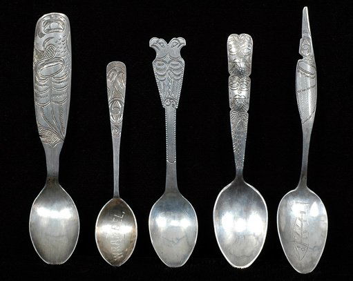 Five Tlingit Coin Silver Engraved Spoons From Sitka