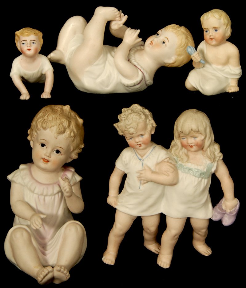 FIVE UNMARKED GERMAN BISQUE FIGURINES