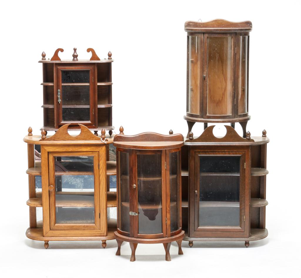 FIVE WOOD AND GLASS DISPLAY CASES.