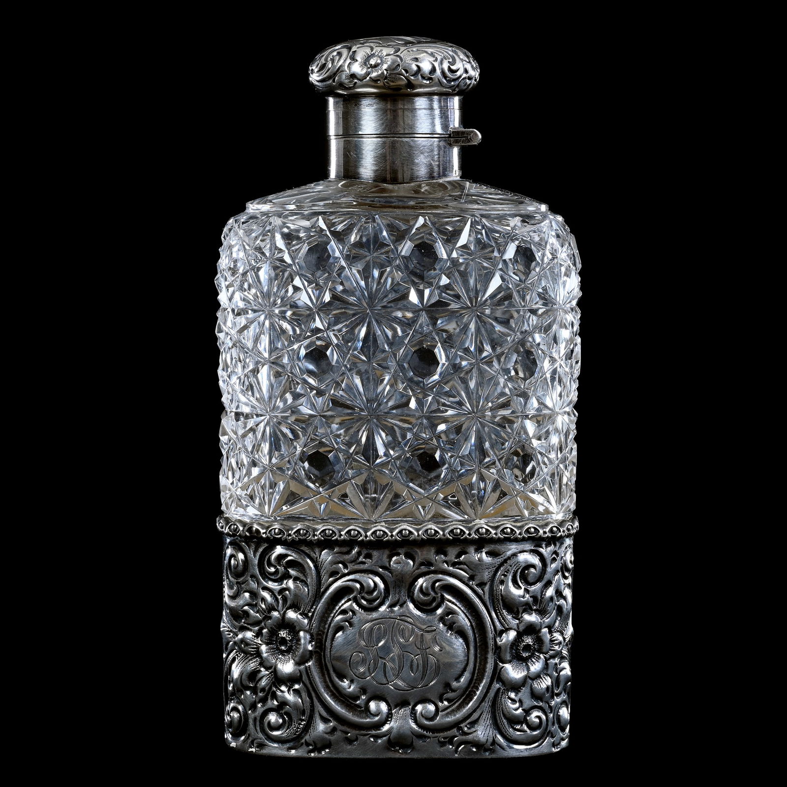 Flask, American Brilliant Cut Glass, Russian Cut Pattern With Removable Sterling Silver Oval Cup