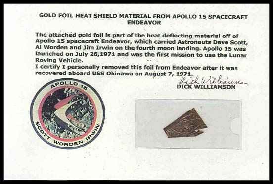 Apollo 16 Lot of 3 NASA Signed Photos, Including 2 MoonwalkersFeb 18, 2026Flown Metal Coin Apollo CollectionFeb 14, 2026Apollo 11 Mission SouvenirsFeb 14, 2026Apollo 13 Flown Kapton Foil Display on COAFeb 14, 2026Apollo 13 Flown Kapton Foil Display on COAFeb 14, 2026Apollo 11 Full Crew Signed ‘Type 1’ Insurance CoverFeb 14, 2026Apollo 17 LM-12 Kapton Foil Section Removed on the Launch PadFeb 14, 2026ASTP Flown Kapton Foil on COAFeb 14, 2026STS-6 Crew Signed Launch Cover with Tracking Station ManagerFeb 14, 2026Apollo & Skylab In Flight & Space Suit Material SamplesFeb 14, 2026John Young's STS-1 Flown and Signed Heat Shield AwardFeb 14, 2026Apollo 16 Young & Duke Signed Cover & Special Honorary Cancelled CoverFeb 14, 2026Lunar Module 3 (Spider) Flown Wire Coil Section on COAFeb 14, 2026On the Moon with Apollo 15Feb 13, 2026Apollo 13 Flown to the Moon Film DisplayFeb 14, 2026Apollo 12 Lunar Surface Flown Film Display on COAFeb 14, 2026