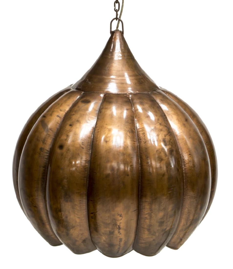 SoldFOLIATE FORM COPPER SINGLE LIGHT CHANDELIERFloriform single-light copper chandelier, closed petals accented with brown paint and hammered marks at top, from top ring, approx: 21"h, 19.5"w, Start Price: $100.00See Sold Price