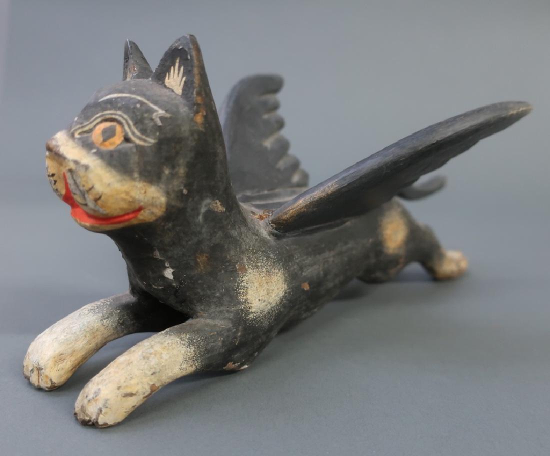 AN ANTIQUE CARVED WOOD FOLK ART CAT. 35 cm wide.
