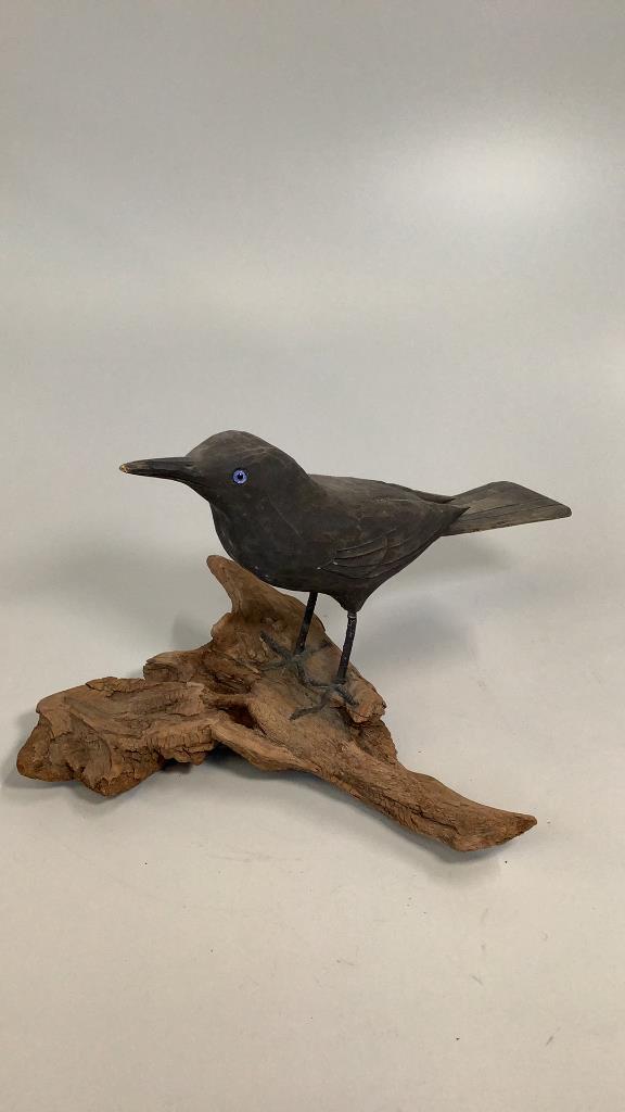 SoldVintage Folk Art Carved & Painted Crow DecoyLikely early to mid 20th century. Having an old black painted surface with tack eyes atop a wooden stand. Some shrinkage cracking to the body. H16 1/2" including standSee Sold Price