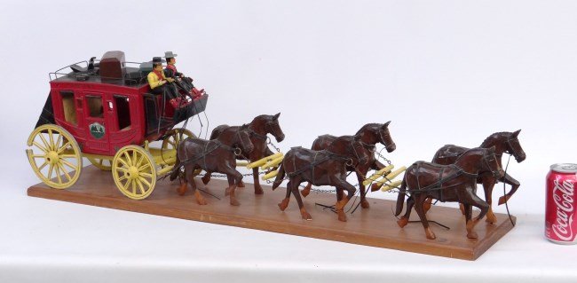 SoldCarved Folk Art Horse Drawn StagecoachEarly 20th or late 19th century, a carved and painted stagecoach all on painted base with 4 horses. Coach with two passengers. Lg. 34", ht. 11.5".See Sold Price