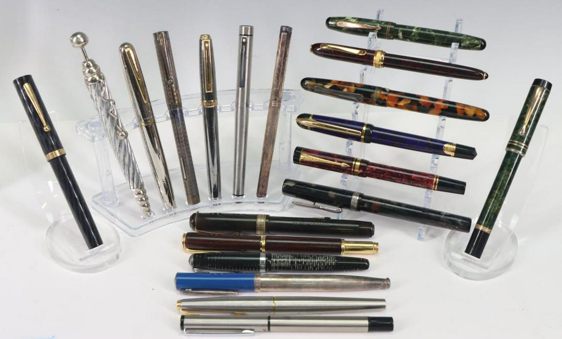 SoldVINTAGE COLLECTION OF 8 FOUNTAIN PENS 6"- VINTAGE COLLECTION OF 8 FOUNTAIN PENS – A HANDSOME ASSORTMENT OF EARLY TO MID-20TH CENTURY FOUNTAIN PENS, INCLUDING EXAMPLES BY WATERMAN, CONKLIN, WAHL-EVERSHARP, AND OTHER UNMARKED OR PARTIALLY MSee Sold Price