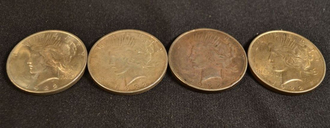 Four 1922 Peace silver dollars: three Denver Mint